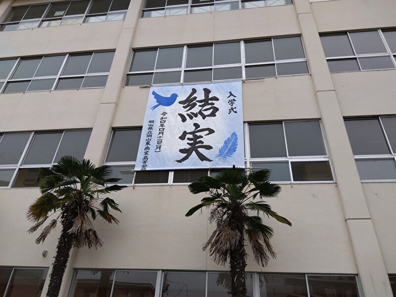 校門入口正面の校舎3階から、書道部が書いた歓迎幕が降ろされて